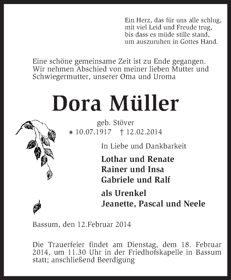 Hier finden Sie alle Traueranzeigen aus der Zeitung, die bisher für Dora Müller erschienen sind. Weitere Traueranzeigen, die in der Zeitung erscheinen, werden hier ebenfalls aufgelistet