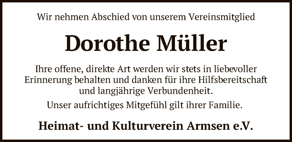 Hier finden Sie alle Traueranzeigen aus der Zeitung, die bisher für Dorothe Müller erschienen sind. Weitere Traueranzeigen, die in der Zeitung erscheinen, werden hier ebenfalls aufgelistet