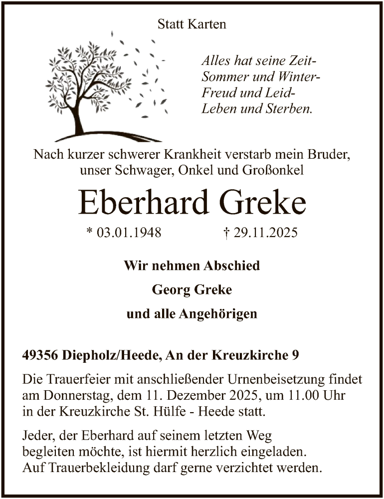 Hier finden Sie alle Traueranzeigen aus der Zeitung, die bisher für Eberhard Greke erschienen sind. Weitere Traueranzeigen, die in der Zeitung erscheinen, werden hier ebenfalls aufgelistet