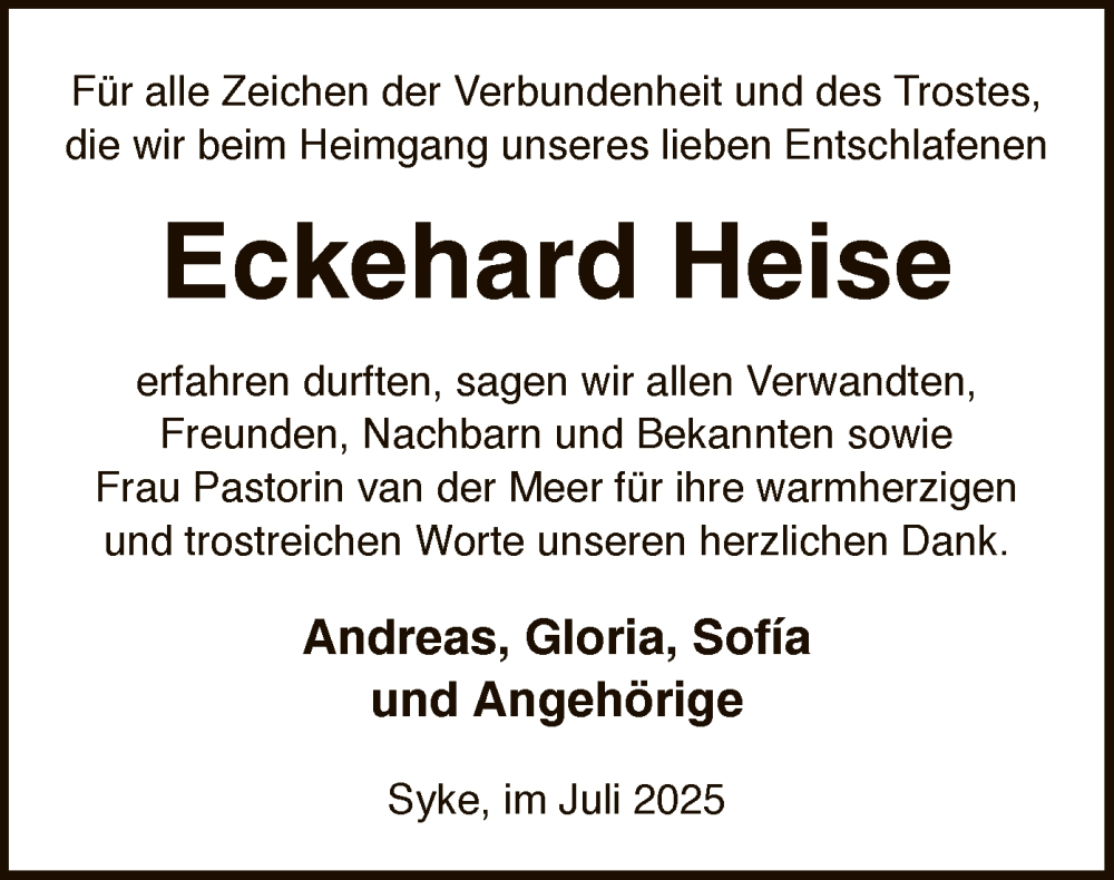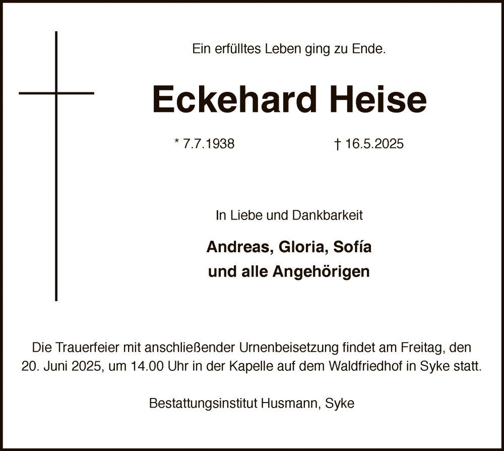 Hier finden Sie alle Traueranzeigen aus der Zeitung, die bisher für Eckehard Heise erschienen sind. Weitere Traueranzeigen, die in der Zeitung erscheinen, werden hier ebenfalls aufgelistet