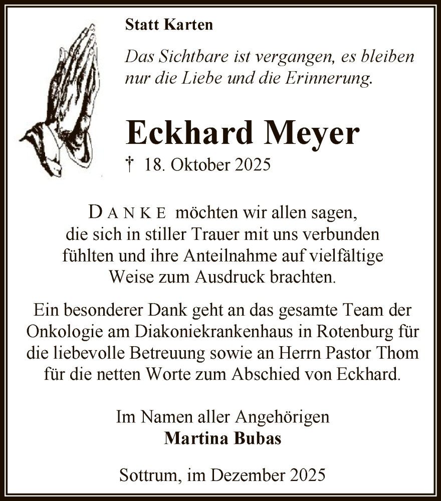 Hier finden Sie alle Traueranzeigen aus der Zeitung, die bisher für Eckhard Meyer erschienen sind. Weitere Traueranzeigen, die in der Zeitung erscheinen, werden hier ebenfalls aufgelistet
