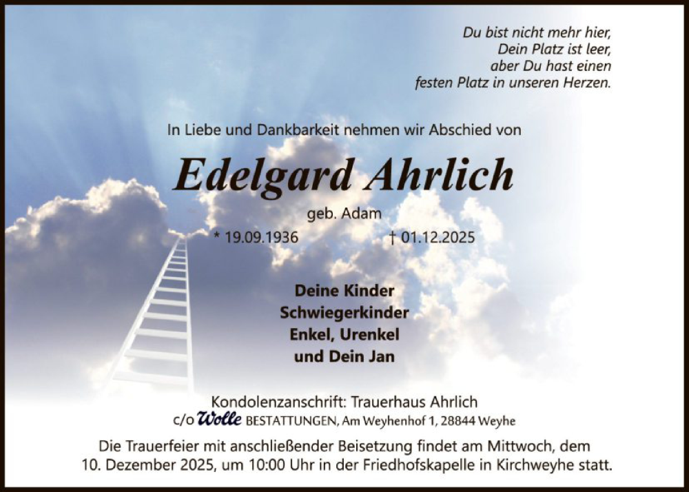 Hier finden Sie alle Traueranzeigen aus der Zeitung, die bisher für Edelgard Ahrlich erschienen sind. Weitere Traueranzeigen, die in der Zeitung erscheinen, werden hier ebenfalls aufgelistet