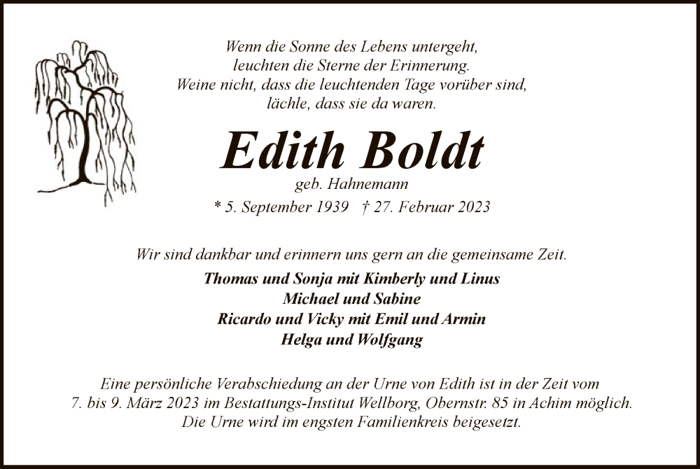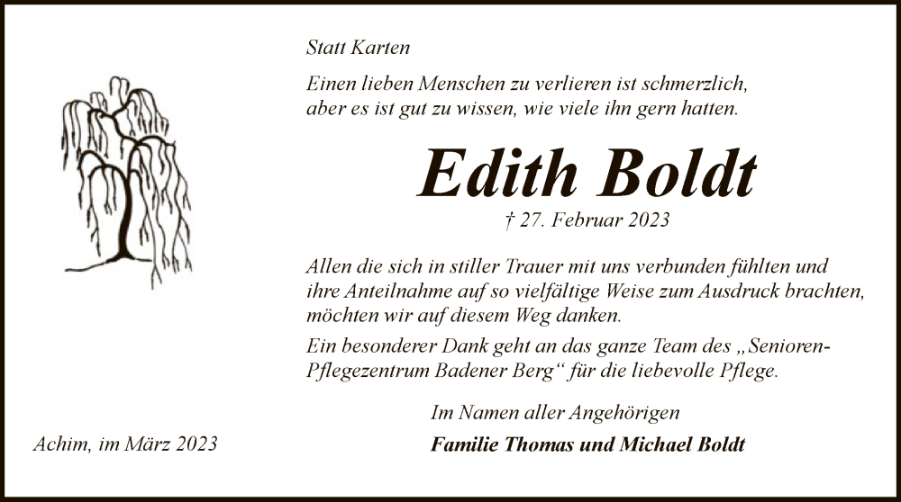 Hier finden Sie alle Traueranzeigen aus der Zeitung, die bisher für Edith Boldt erschienen sind. Weitere Traueranzeigen, die in der Zeitung erscheinen, werden hier ebenfalls aufgelistet