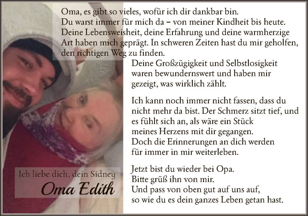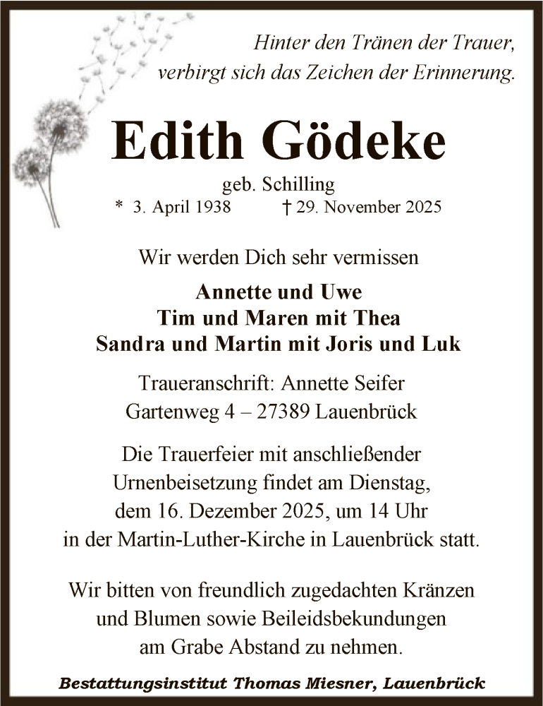 Hier finden Sie alle Traueranzeigen aus der Zeitung, die bisher für Edith Gödeke erschienen sind. Weitere Traueranzeigen, die in der Zeitung erscheinen, werden hier ebenfalls aufgelistet