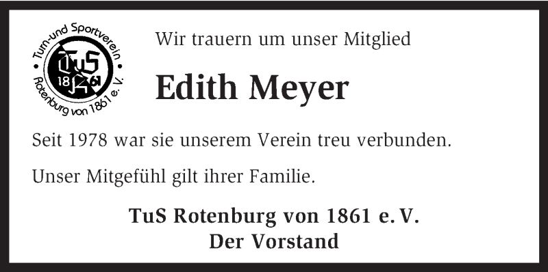 Hier finden Sie alle Traueranzeigen aus der Zeitung, die bisher für Edith Meyer erschienen sind. Weitere Traueranzeigen, die in der Zeitung erscheinen, werden hier ebenfalls aufgelistet