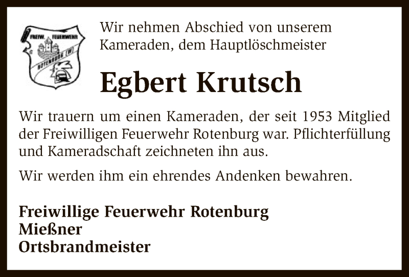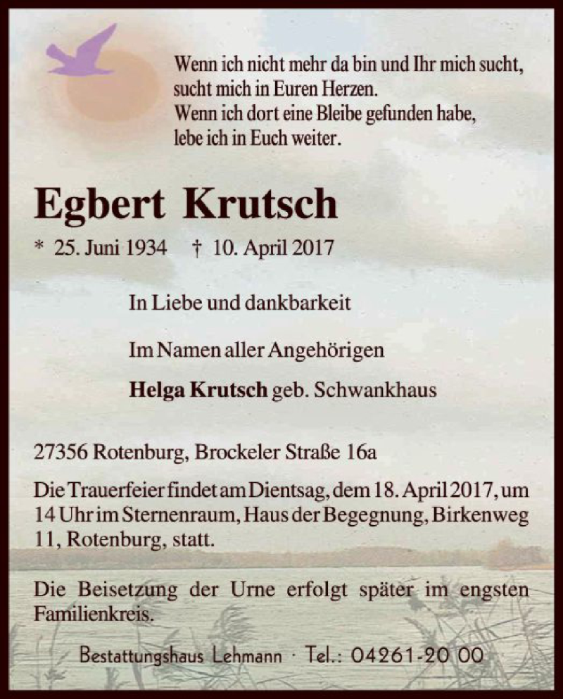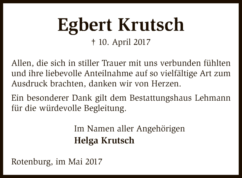 Hier finden Sie alle Traueranzeigen aus der Zeitung, die bisher für Egbert Krutsch erschienen sind. Weitere Traueranzeigen, die in der Zeitung erscheinen, werden hier ebenfalls aufgelistet