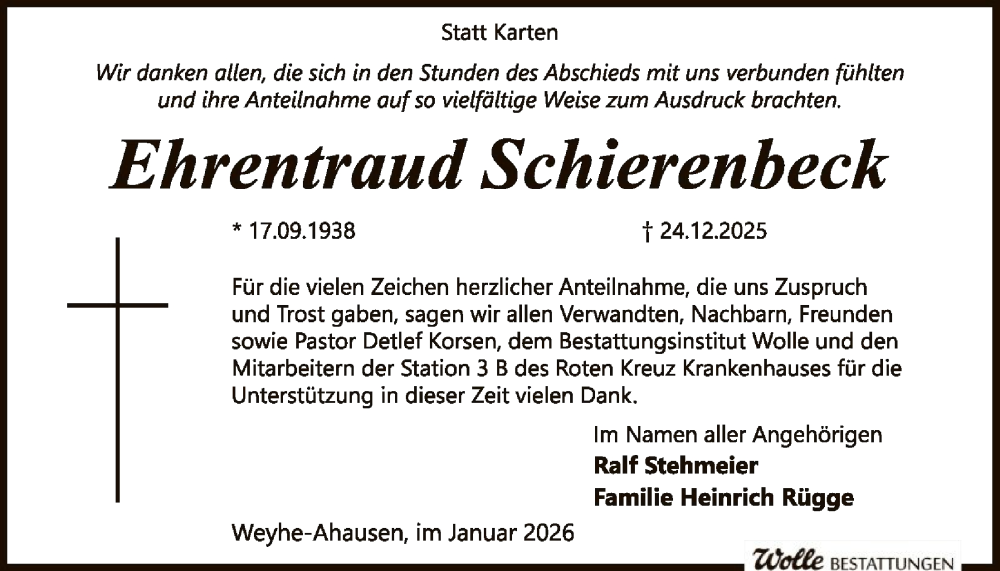 Hier finden Sie alle Traueranzeigen aus der Zeitung, die bisher für Ehrentraud Schierenbeck erschienen sind. Weitere Traueranzeigen, die in der Zeitung erscheinen, werden hier ebenfalls aufgelistet