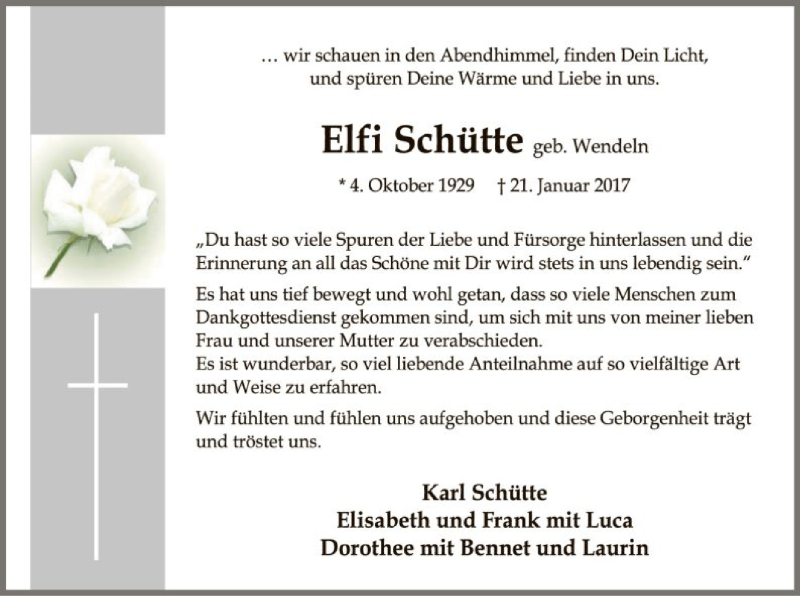 Hier finden Sie alle Traueranzeigen aus der Zeitung, die bisher für Elfi Schütte erschienen sind. Weitere Traueranzeigen, die in der Zeitung erscheinen, werden hier ebenfalls aufgelistet