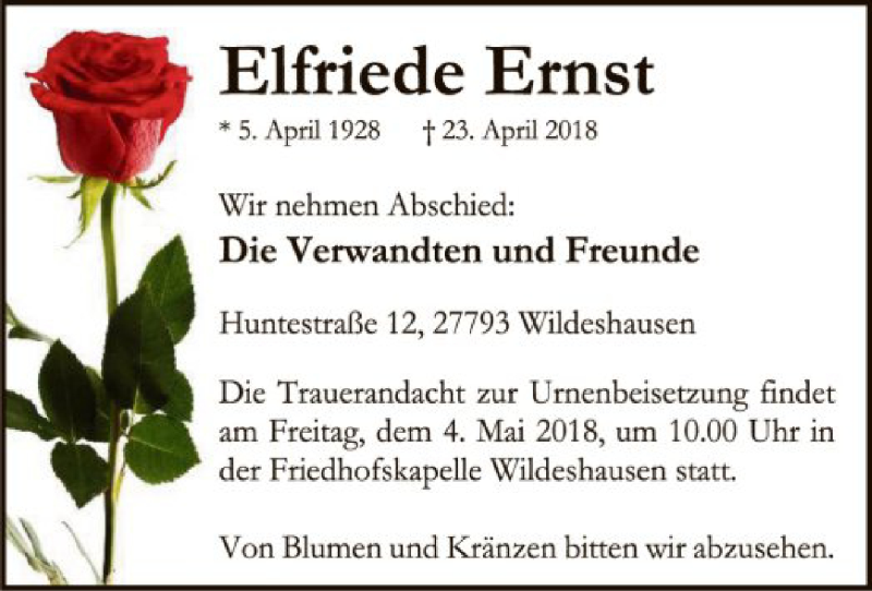 Hier finden Sie alle Traueranzeigen aus der Zeitung, die bisher für Elfriede Ernst erschienen sind. Weitere Traueranzeigen, die in der Zeitung erscheinen, werden hier ebenfalls aufgelistet