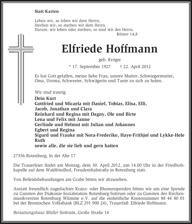 Hier finden Sie alle Traueranzeigen aus der Zeitung, die bisher für Elfriede Hoffmann erschienen sind. Weitere Traueranzeigen, die in der Zeitung erscheinen, werden hier ebenfalls aufgelistet