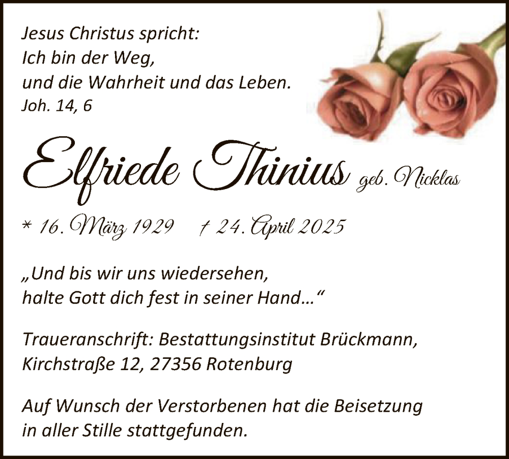 Hier finden Sie alle Traueranzeigen aus der Zeitung, die bisher für Elfriede Thinius erschienen sind. Weitere Traueranzeigen, die in der Zeitung erscheinen, werden hier ebenfalls aufgelistet