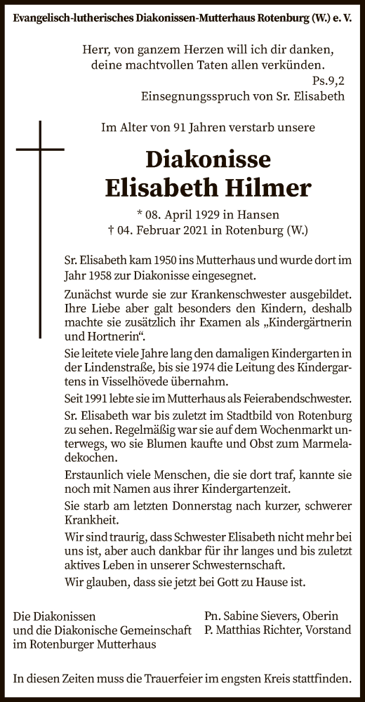 Hier finden Sie alle Traueranzeigen aus der Zeitung, die bisher für Elisabeth Hilmer erschienen sind. Weitere Traueranzeigen, die in der Zeitung erscheinen, werden hier ebenfalls aufgelistet