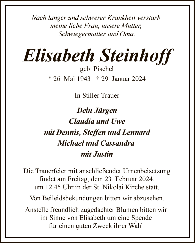 Hier finden Sie alle Traueranzeigen aus der Zeitung, die bisher für Elisabeth Steinhoff erschienen sind. Weitere Traueranzeigen, die in der Zeitung erscheinen, werden hier ebenfalls aufgelistet