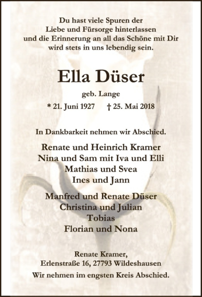 Hier finden Sie alle Traueranzeigen aus der Zeitung, die bisher für Ella Düser erschienen sind. Weitere Traueranzeigen, die in der Zeitung erscheinen, werden hier ebenfalls aufgelistet