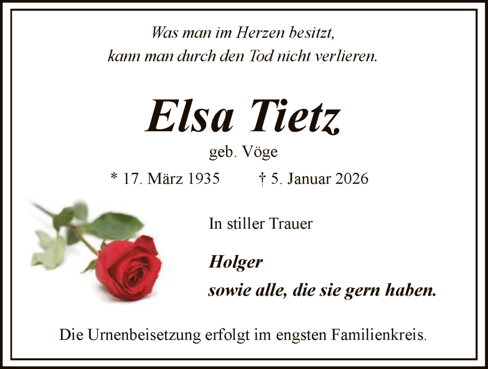 Hier finden Sie alle Traueranzeigen aus der Zeitung, die bisher für Elsa Tietz erschienen sind. Weitere Traueranzeigen, die in der Zeitung erscheinen, werden hier ebenfalls aufgelistet