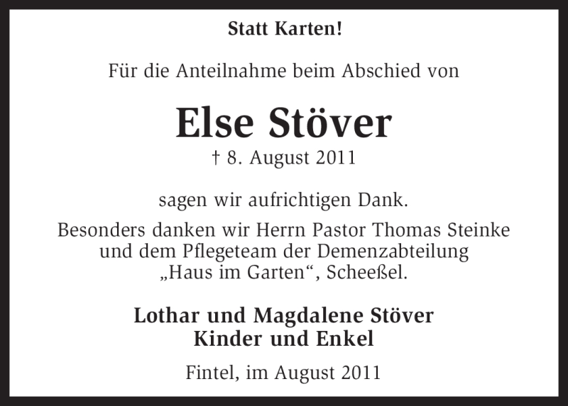 Hier finden Sie alle Traueranzeigen aus der Zeitung, die bisher für Else Stöver erschienen sind. Weitere Traueranzeigen, die in der Zeitung erscheinen, werden hier ebenfalls aufgelistet
