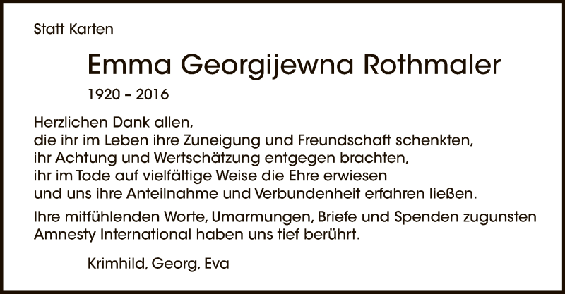 Hier finden Sie alle Traueranzeigen aus der Zeitung, die bisher für Emma Georgijewna Rothmaler erschienen sind. Weitere Traueranzeigen, die in der Zeitung erscheinen, werden hier ebenfalls aufgelistet