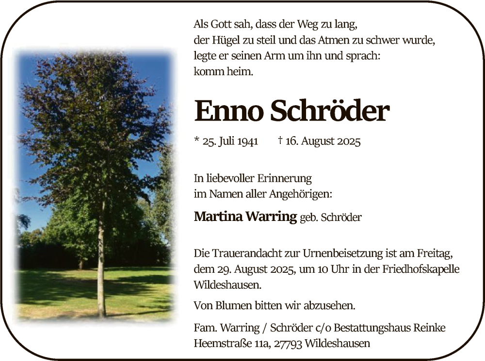 Hier finden Sie alle Traueranzeigen aus der Zeitung, die bisher für Enno Schröder erschienen sind. Weitere Traueranzeigen, die in der Zeitung erscheinen, werden hier ebenfalls aufgelistet