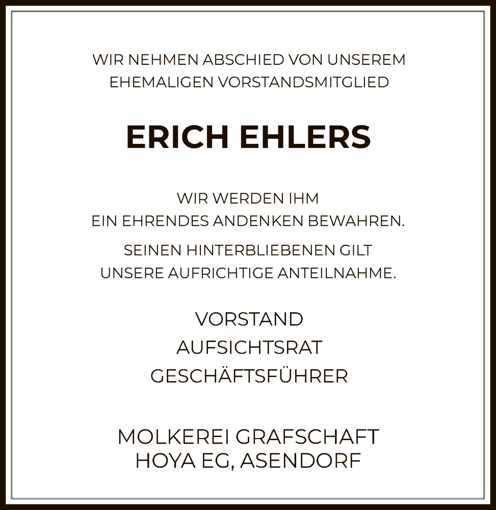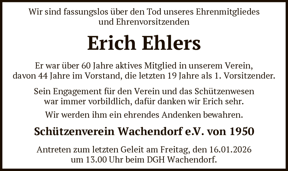 Hier finden Sie alle Traueranzeigen aus der Zeitung, die bisher für Erich Ehlers erschienen sind. Weitere Traueranzeigen, die in der Zeitung erscheinen, werden hier ebenfalls aufgelistet