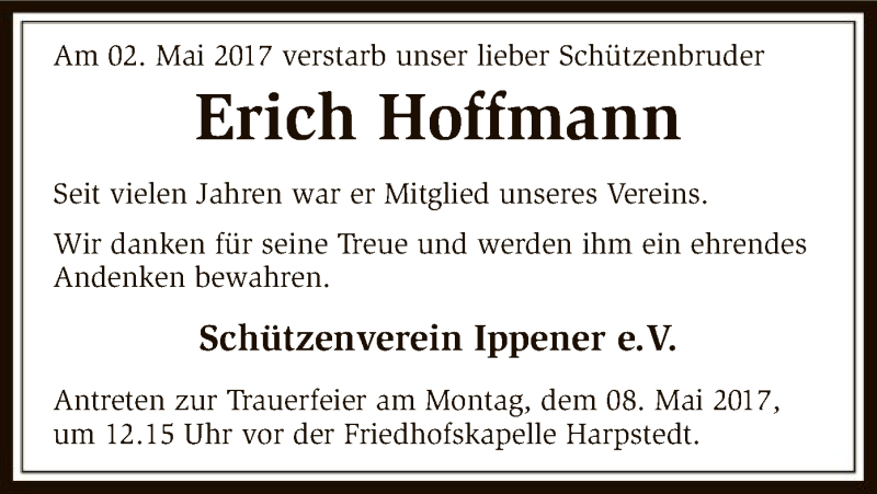 Hier finden Sie alle Traueranzeigen aus der Zeitung, die bisher für Erich Hoffmann erschienen sind. Weitere Traueranzeigen, die in der Zeitung erscheinen, werden hier ebenfalls aufgelistet