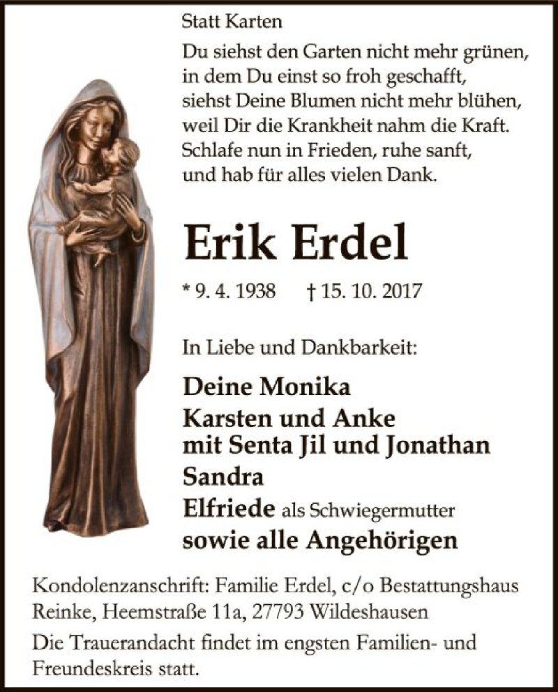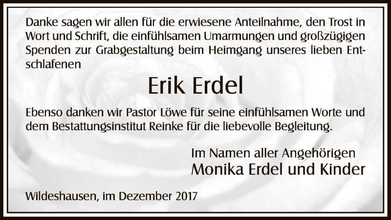 Hier finden Sie alle Traueranzeigen aus der Zeitung, die bisher für Erik Erdel erschienen sind. Weitere Traueranzeigen, die in der Zeitung erscheinen, werden hier ebenfalls aufgelistet