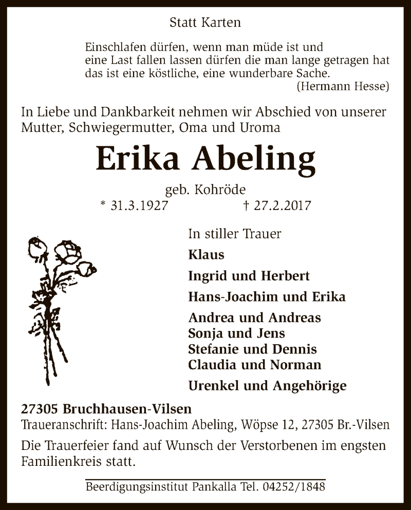 Hier finden Sie alle Traueranzeigen aus der Zeitung, die bisher für Erika Abeling erschienen sind. Weitere Traueranzeigen, die in der Zeitung erscheinen, werden hier ebenfalls aufgelistet