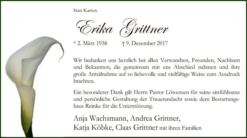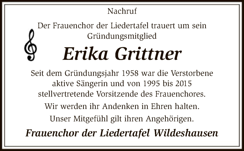 Hier finden Sie alle Traueranzeigen aus der Zeitung, die bisher für Erika Grittner erschienen sind. Weitere Traueranzeigen, die in der Zeitung erscheinen, werden hier ebenfalls aufgelistet