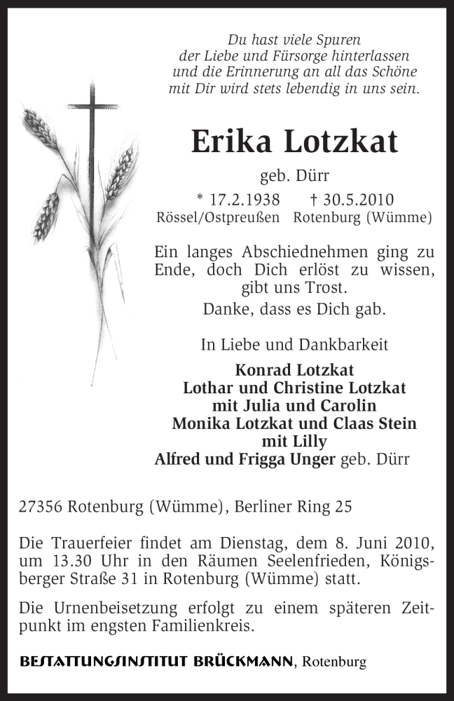 Hier finden Sie alle Traueranzeigen aus der Zeitung, die bisher für Erika Lotzkat erschienen sind. Weitere Traueranzeigen, die in der Zeitung erscheinen, werden hier ebenfalls aufgelistet