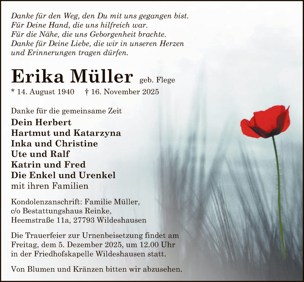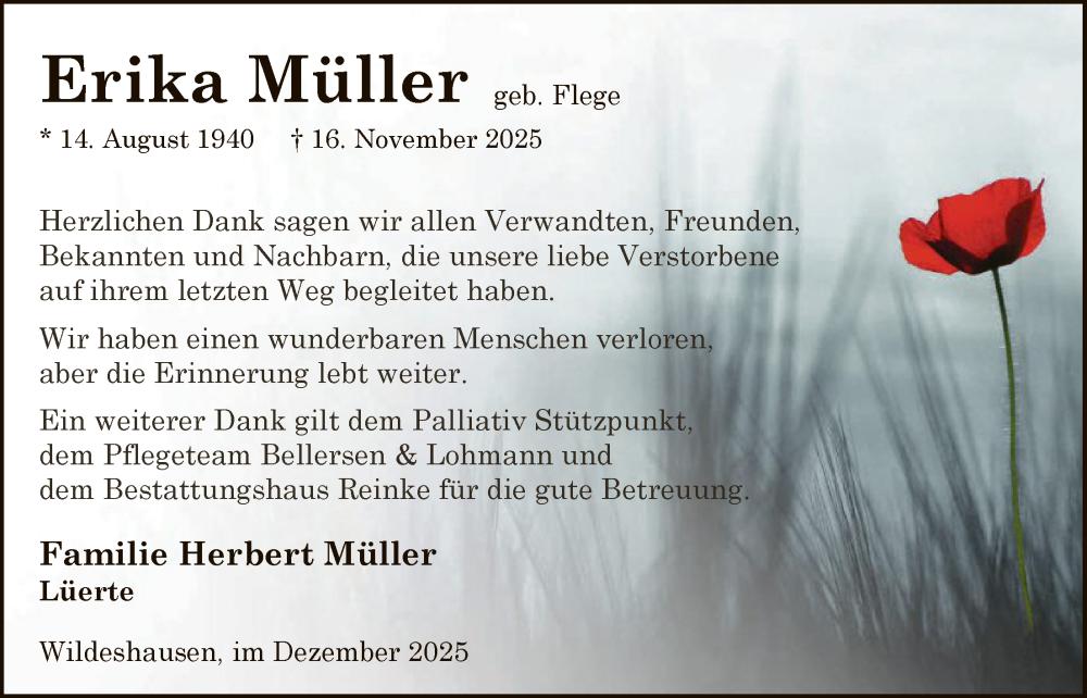 Hier finden Sie alle Traueranzeigen aus der Zeitung, die bisher für Erika Müller erschienen sind. Weitere Traueranzeigen, die in der Zeitung erscheinen, werden hier ebenfalls aufgelistet