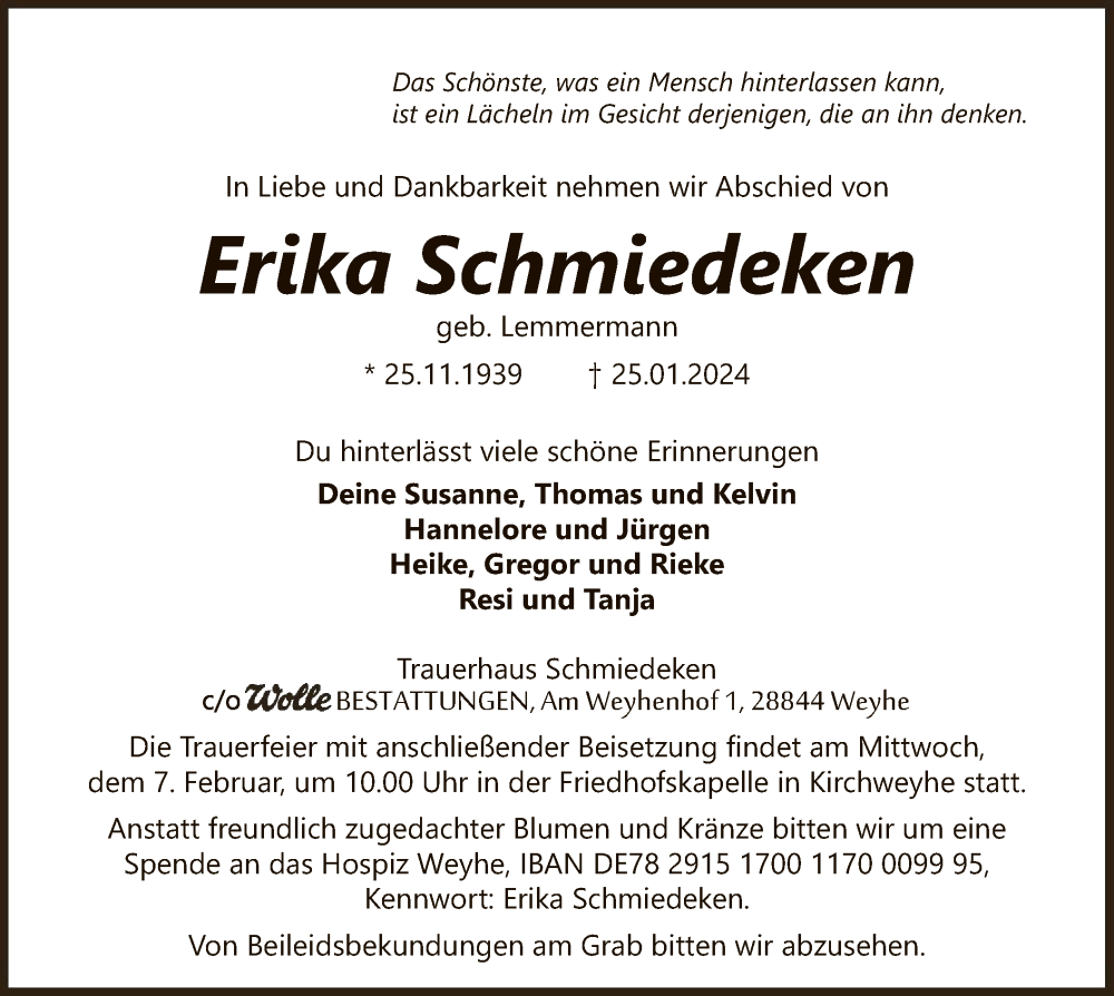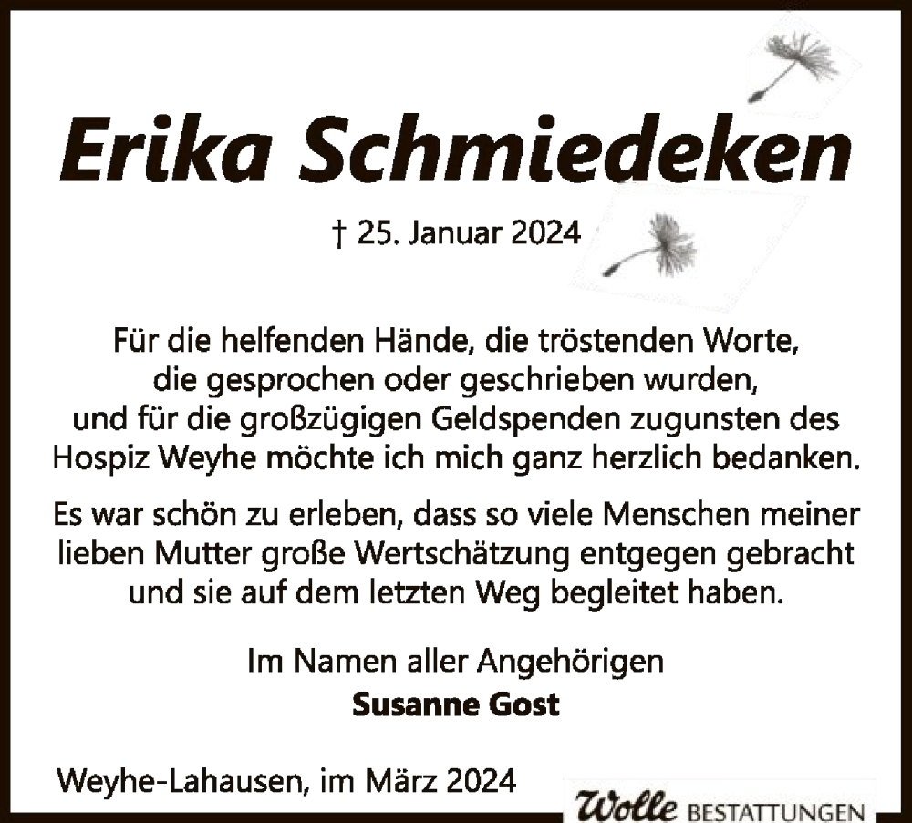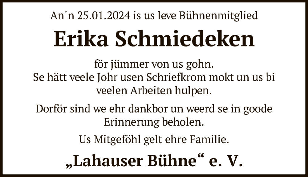 Hier finden Sie alle Traueranzeigen aus der Zeitung, die bisher für Erika Schmiedeken erschienen sind. Weitere Traueranzeigen, die in der Zeitung erscheinen, werden hier ebenfalls aufgelistet