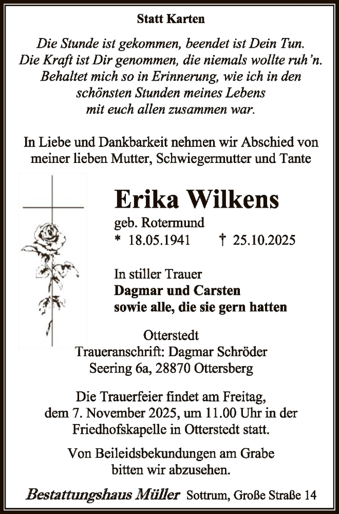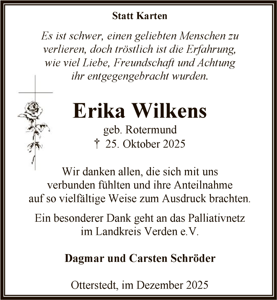 Hier finden Sie alle Traueranzeigen aus der Zeitung, die bisher für Erika Wilkens erschienen sind. Weitere Traueranzeigen, die in der Zeitung erscheinen, werden hier ebenfalls aufgelistet