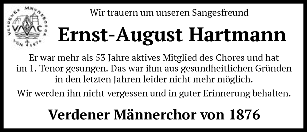 Hier finden Sie alle Traueranzeigen aus der Zeitung, die bisher für Ernst-August Hartmann erschienen sind. Weitere Traueranzeigen, die in der Zeitung erscheinen, werden hier ebenfalls aufgelistet
