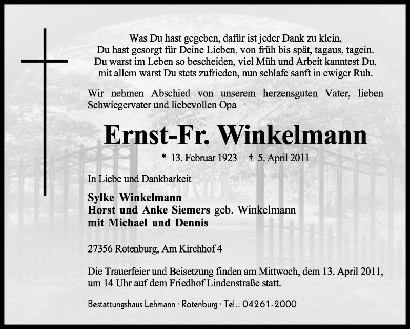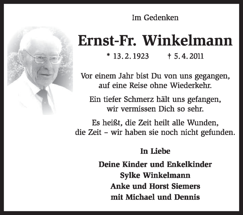Hier finden Sie alle Traueranzeigen aus der Zeitung, die bisher für Ernst-Fr. Winkelmann erschienen sind. Weitere Traueranzeigen, die in der Zeitung erscheinen, werden hier ebenfalls aufgelistet