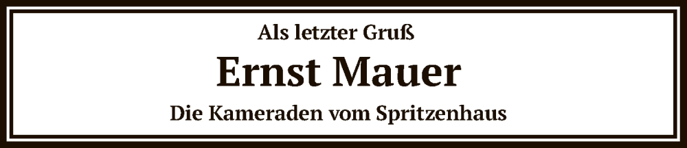 Hier finden Sie alle Traueranzeigen aus der Zeitung, die bisher für Ernst Mauer erschienen sind. Weitere Traueranzeigen, die in der Zeitung erscheinen, werden hier ebenfalls aufgelistet