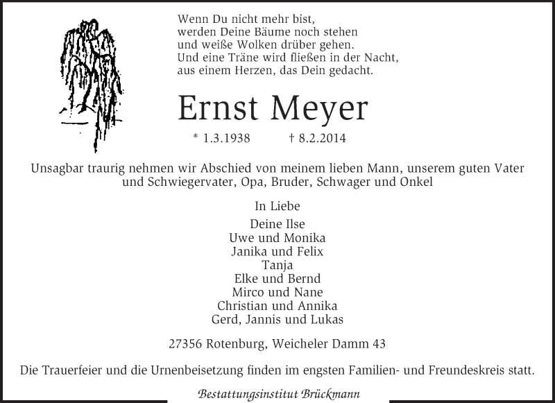 Hier finden Sie alle Traueranzeigen aus der Zeitung, die bisher für Ernst Meyer erschienen sind. Weitere Traueranzeigen, die in der Zeitung erscheinen, werden hier ebenfalls aufgelistet