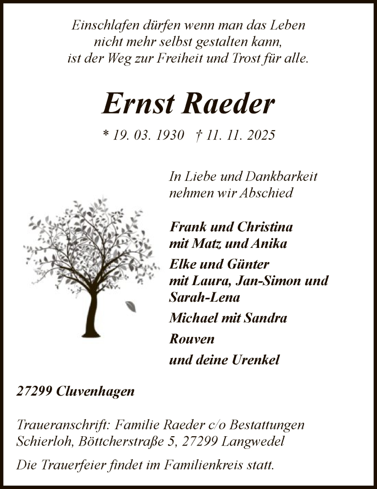Hier finden Sie alle Traueranzeigen aus der Zeitung, die bisher für Ernst Raeder erschienen sind. Weitere Traueranzeigen, die in der Zeitung erscheinen, werden hier ebenfalls aufgelistet