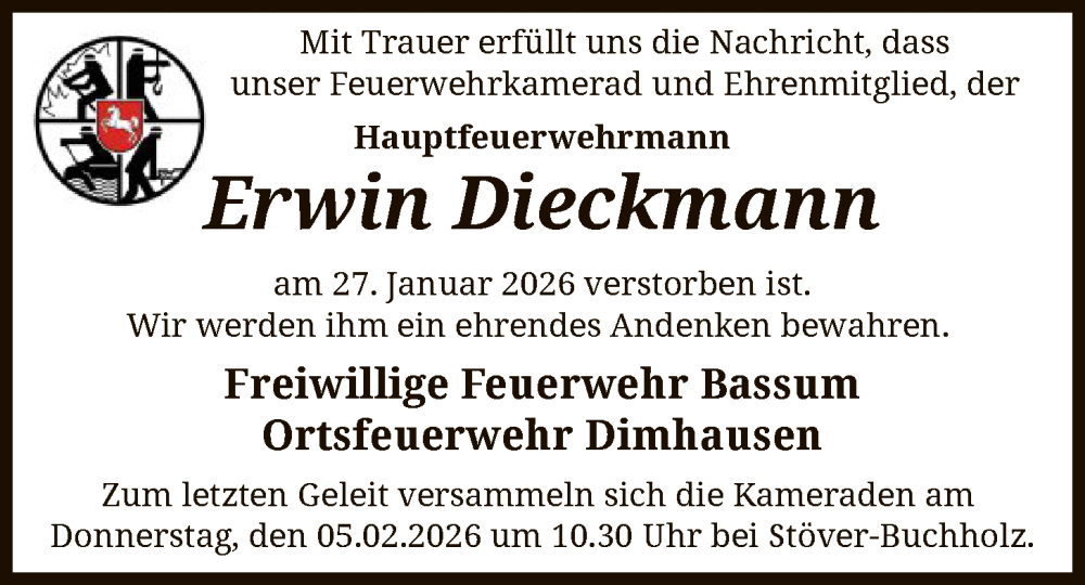 Hier finden Sie alle Traueranzeigen aus der Zeitung, die bisher für Erwin Dieckmann erschienen sind. Weitere Traueranzeigen, die in der Zeitung erscheinen, werden hier ebenfalls aufgelistet