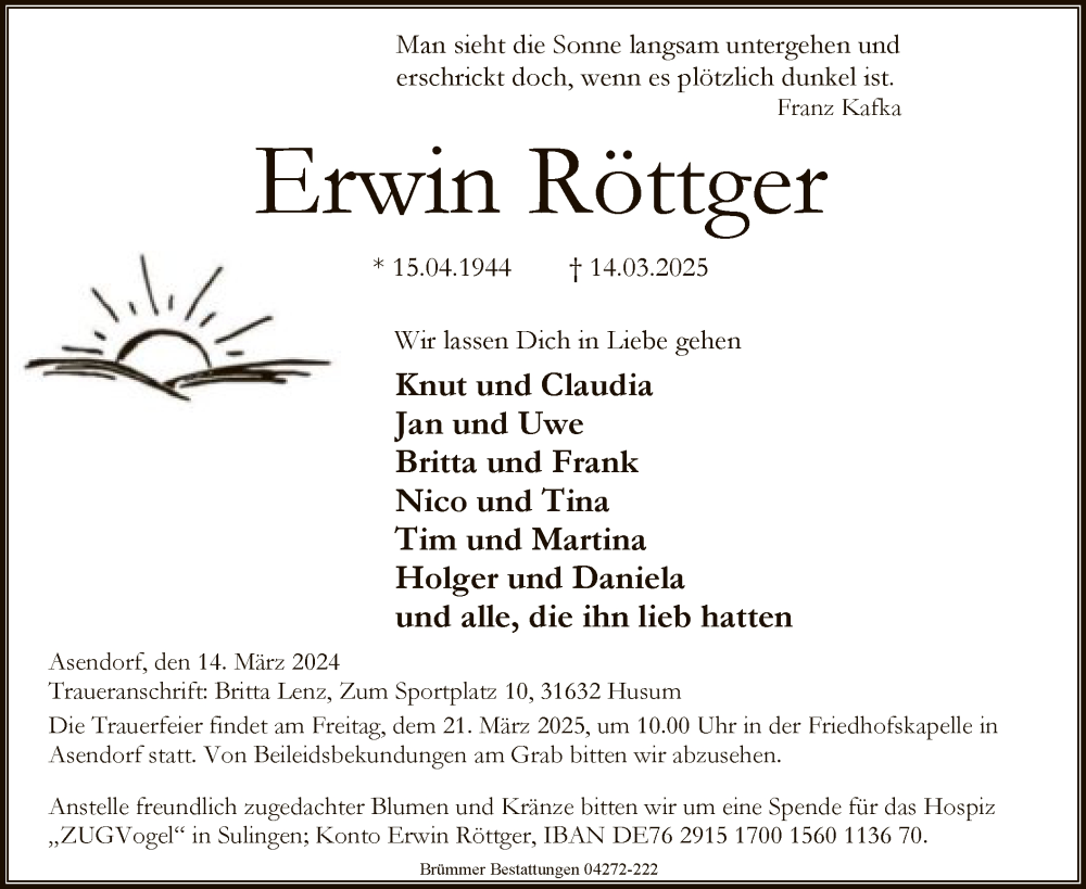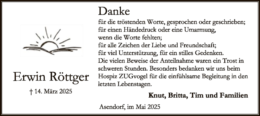 Hier finden Sie alle Traueranzeigen aus der Zeitung, die bisher für Erwin Röttger erschienen sind. Weitere Traueranzeigen, die in der Zeitung erscheinen, werden hier ebenfalls aufgelistet