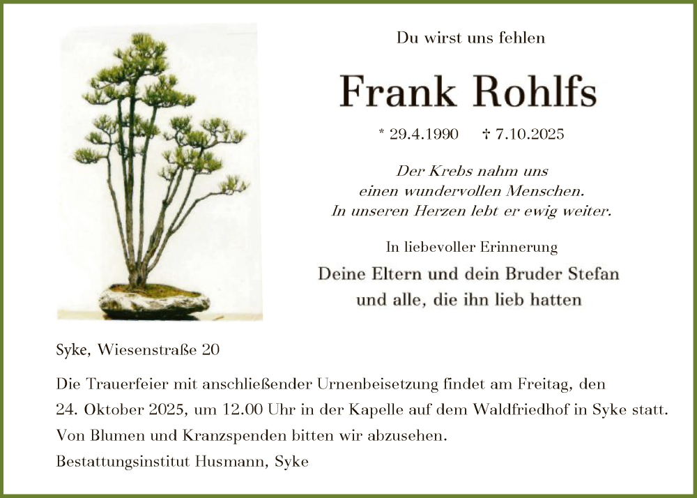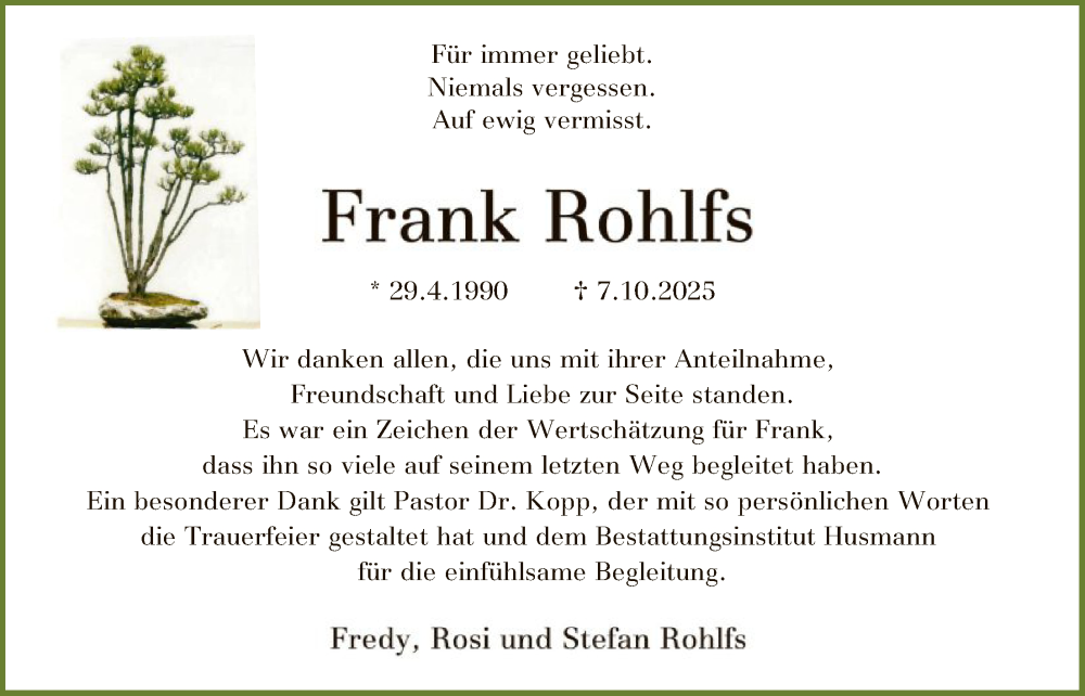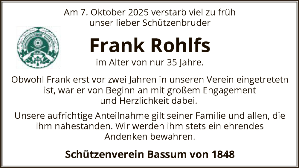 Hier finden Sie alle Traueranzeigen aus der Zeitung, die bisher für Frank Rohlfs erschienen sind. Weitere Traueranzeigen, die in der Zeitung erscheinen, werden hier ebenfalls aufgelistet