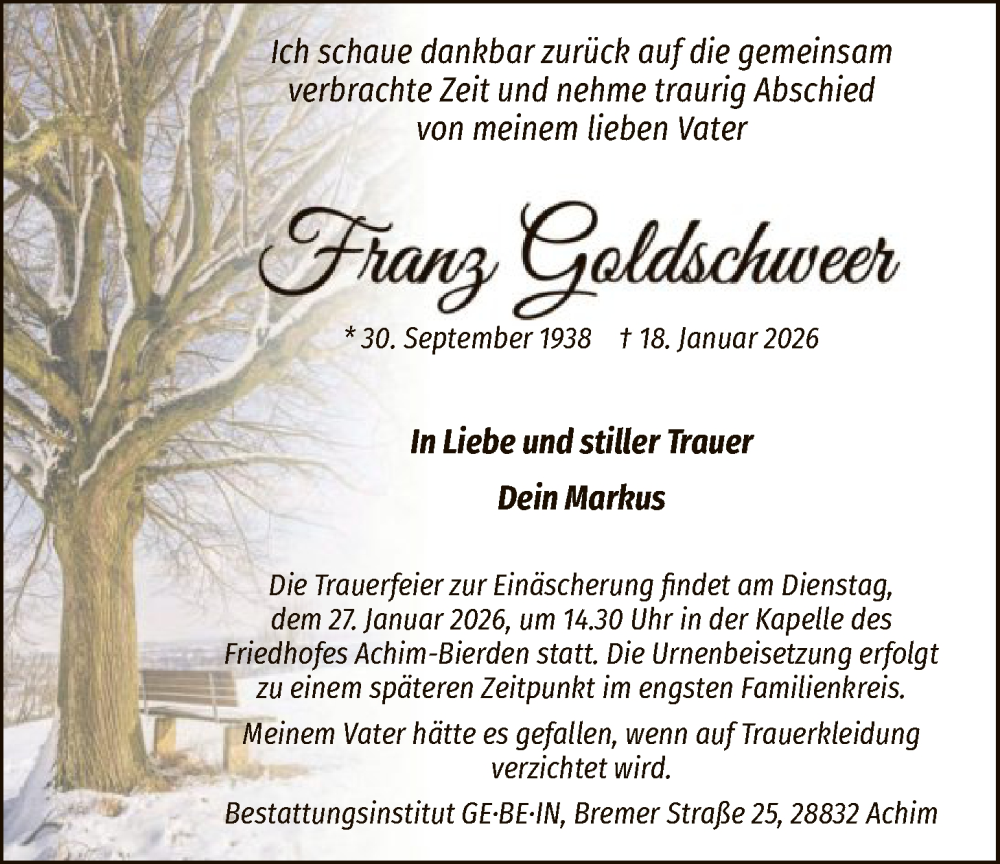 Hier finden Sie alle Traueranzeigen aus der Zeitung, die bisher für Franz Goldschweer erschienen sind. Weitere Traueranzeigen, die in der Zeitung erscheinen, werden hier ebenfalls aufgelistet