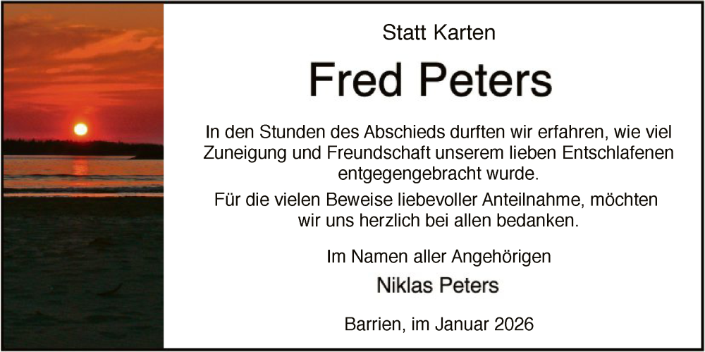 Hier finden Sie alle Traueranzeigen aus der Zeitung, die bisher für Fred Peters erschienen sind. Weitere Traueranzeigen, die in der Zeitung erscheinen, werden hier ebenfalls aufgelistet