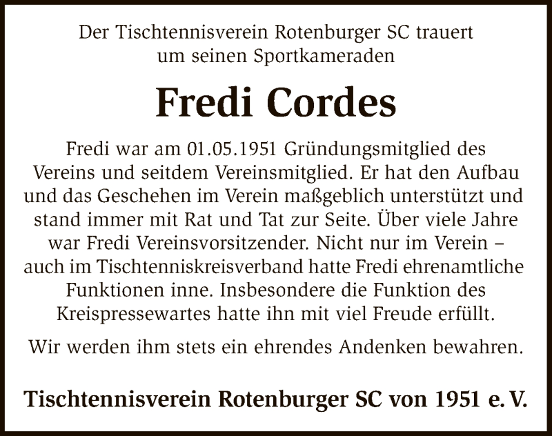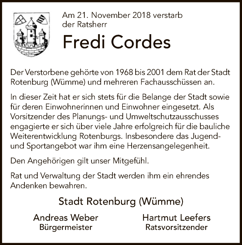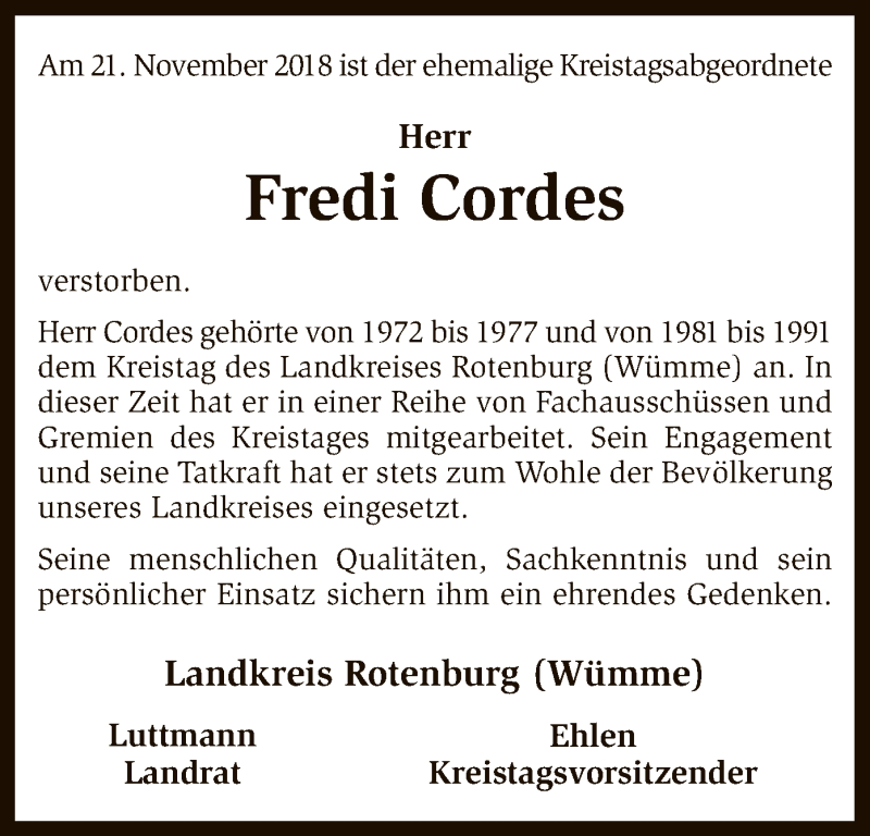 Hier finden Sie alle Traueranzeigen aus der Zeitung, die bisher für Fredi Cordes erschienen sind. Weitere Traueranzeigen, die in der Zeitung erscheinen, werden hier ebenfalls aufgelistet