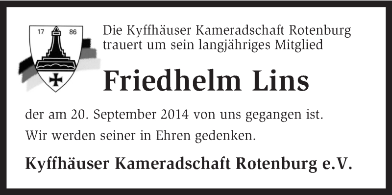 Hier finden Sie alle Traueranzeigen aus der Zeitung, die bisher für Friedhelm Lins erschienen sind. Weitere Traueranzeigen, die in der Zeitung erscheinen, werden hier ebenfalls aufgelistet
