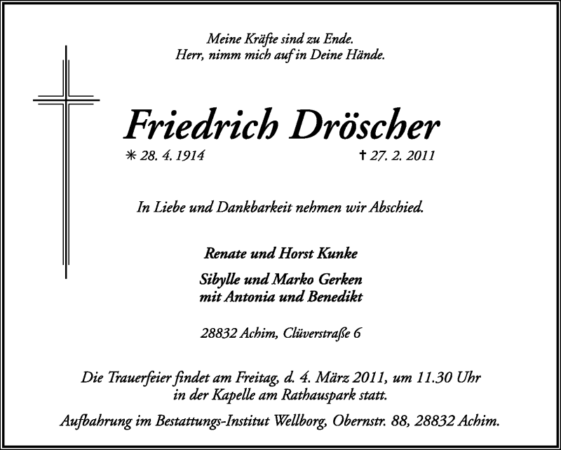 Hier finden Sie alle Traueranzeigen aus der Zeitung, die bisher für Friedrich Dröscher erschienen sind. Weitere Traueranzeigen, die in der Zeitung erscheinen, werden hier ebenfalls aufgelistet