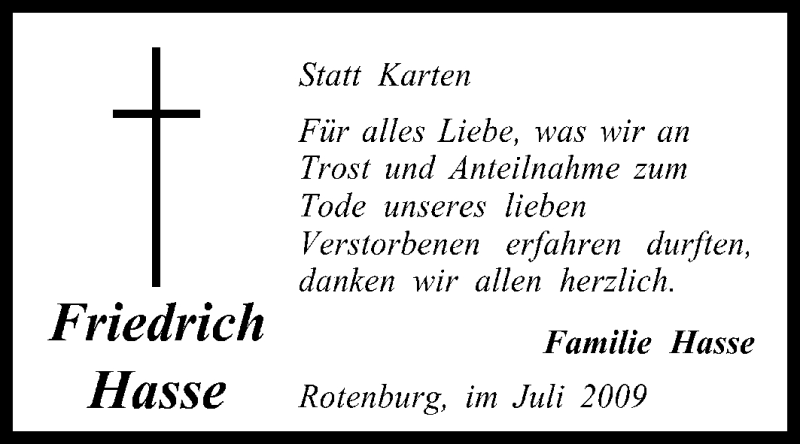 Hier finden Sie alle Traueranzeigen aus der Zeitung, die bisher für Friedrich Hasse erschienen sind. Weitere Traueranzeigen, die in der Zeitung erscheinen, werden hier ebenfalls aufgelistet