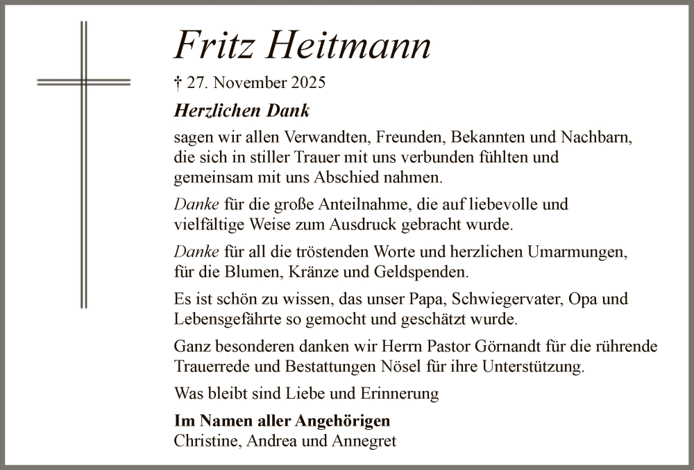 Hier finden Sie alle Traueranzeigen aus der Zeitung, die bisher für Fritz Heitmann erschienen sind. Weitere Traueranzeigen, die in der Zeitung erscheinen, werden hier ebenfalls aufgelistet