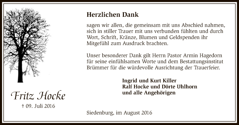 Hier finden Sie alle Traueranzeigen aus der Zeitung, die bisher für Fritz Hocke erschienen sind. Weitere Traueranzeigen, die in der Zeitung erscheinen, werden hier ebenfalls aufgelistet