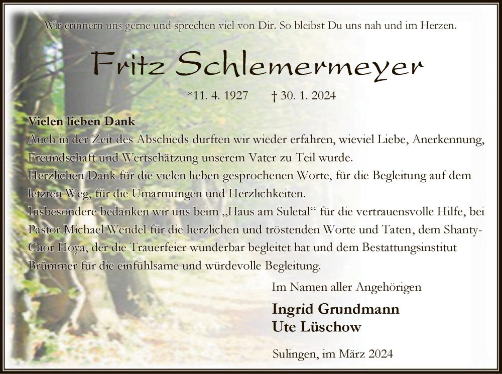 Hier finden Sie alle Traueranzeigen aus der Zeitung, die bisher für Fritz Schlemermeyer erschienen sind. Weitere Traueranzeigen, die in der Zeitung erscheinen, werden hier ebenfalls aufgelistet