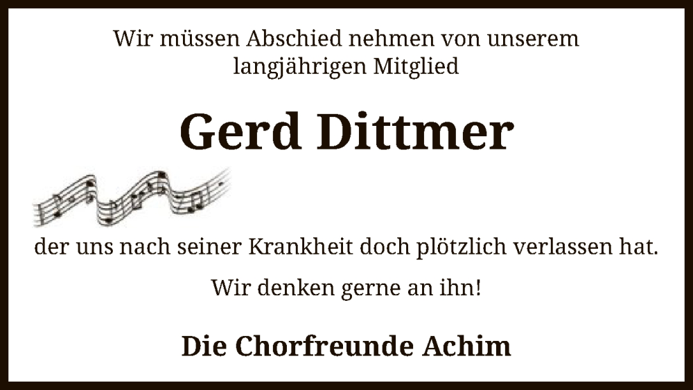 Hier finden Sie alle Traueranzeigen aus der Zeitung, die bisher für Gerd Dittmer erschienen sind. Weitere Traueranzeigen, die in der Zeitung erscheinen, werden hier ebenfalls aufgelistet