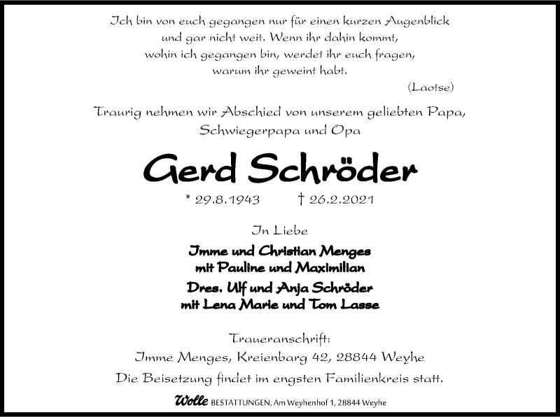 Hier finden Sie alle Traueranzeigen aus der Zeitung, die bisher für Gerd Schröder erschienen sind. Weitere Traueranzeigen, die in der Zeitung erscheinen, werden hier ebenfalls aufgelistet